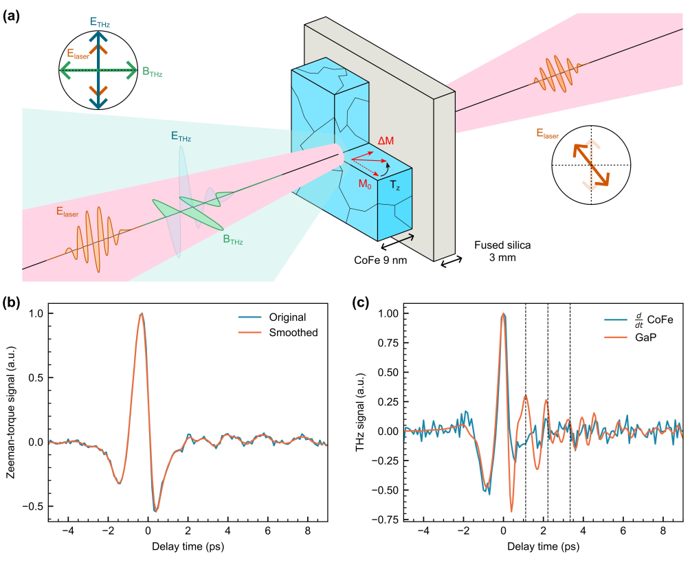 Figure 5: Experimental demonstration of strong-field THz applications. (a) Schematic diagram of Zeeman torque-based detection of strong-field THz magnetic-field components; (b) detection signals of magnetic-field components; and (c) comparison of magnetic-field components and electric-field components.