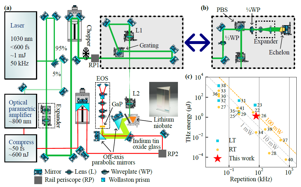 Figure 1: Schematic diagram of high-power strong-field THz generation and detection devices. (a) Based on grating-type TPF techniques; (b) based on echelon-type TPF techniques; and (c) comparison and statistics of output power of high-power THz sources in recent years.