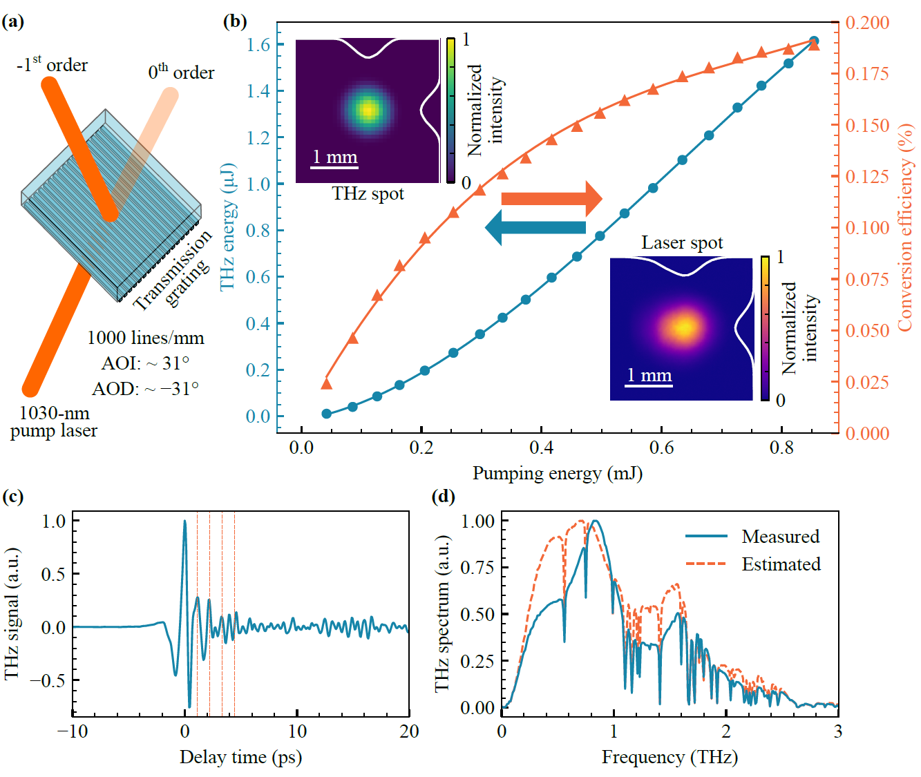 Figure 2: THz generation using a transmission grating. (a) Schematic diagram of grating parameters and configuration; (b) dependence of THz single-pulse energy and conversion efficiency on pumping single-pulse energy, with insets showing focused THz spots and laser spots; (c) typical THz time-domain waveform and (d) the corresponding spectrum.