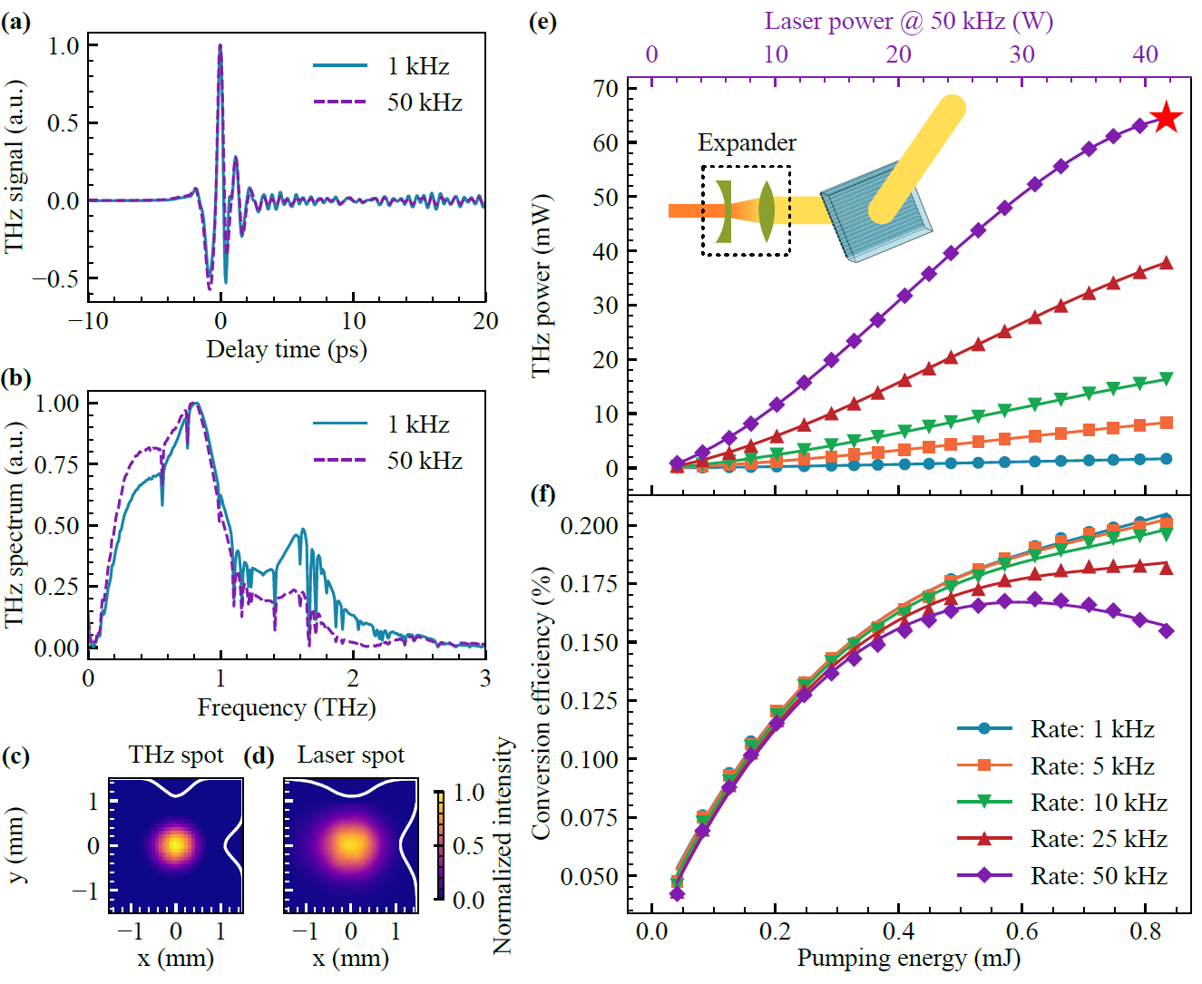 Figure 4: Characterization of THz output performance under high-power pumping. (a) THz time-domain waveforms at repetition rates of 1kHz and 50kHz; (b) corresponding spectrum; (c) THz focal spot and laser spot; (e) THz power curve; and (f) THz efficiency curve.