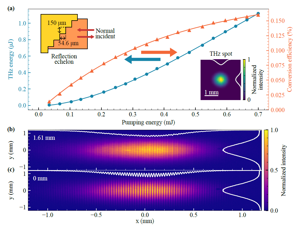 Figure 3: Characterization of the THz output from reflective echelon mirrors. (a) THz single-pulse energy and conversion efficiency as functions of pump energy; (b) laser spot on the crystal’s input surface; and (c) laser spot with the maximum contrast.
